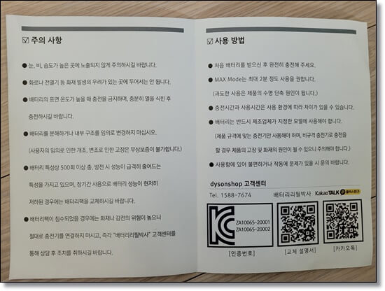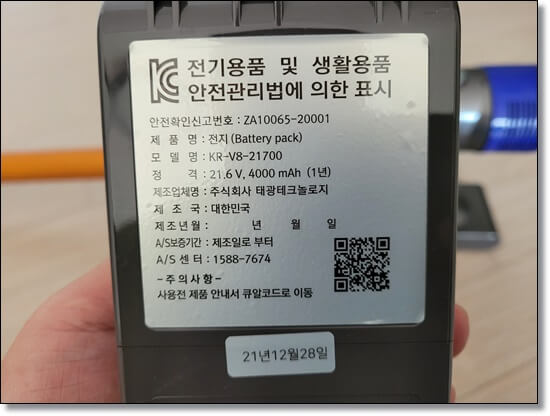 다이슨 정품 배터리는 2800mAH 용량인데 비해 이번에 구입한 배터리는 4000mAH 크기입니다. 그래서 무게가 무겁지만 오래 쓸 수 있을것 같아 좋았습니다. 제조국 대한민국을 보니 든든(?)해지더군요.
