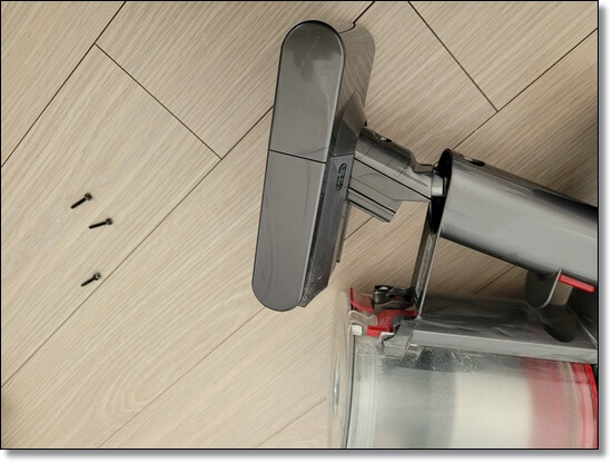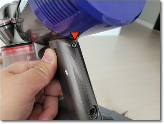먼저 왼쪽 사진의 손잡이 윗부분 나사를 먼저 풀어줍니다. 그리고 청소기 통과 배터리 사이에 나사 2개를 더 풀어줍니다.
