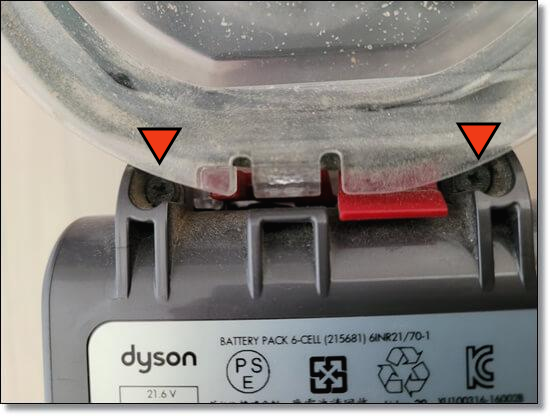 먼저 왼쪽 사진의 손잡이 윗부분 나사를 먼저 풀어줍니다. 그리고 청소기 통과 배터리 사이에 나사 2개를 더 풀어줍니다.