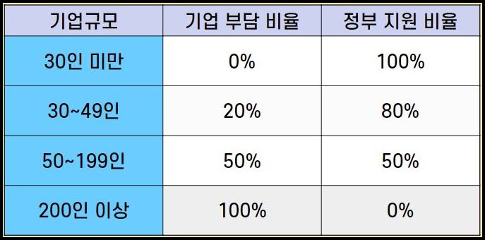 - 기존에는 50인 미만 기업은 기업기여금의 100%를 정부가 지원하고, 50인 이상 기업은 기업기여금의 80%를 정부가 지원 (기업 부담금 20%) 지원했습다.