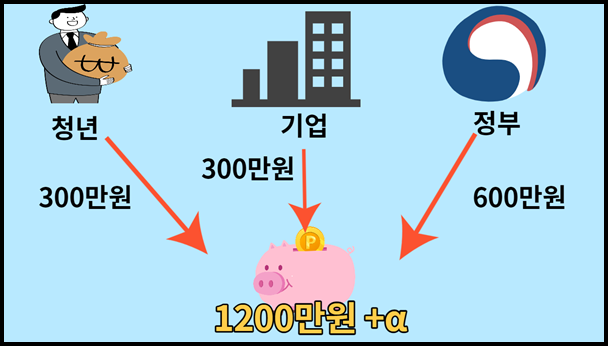 - 청년 본인이 2년간 300만원(매월 12만 5천원)을 적립하면 정부(취업지원금 600만원)와 기업(300만원, 정부지원)이 공동 적립합니다.