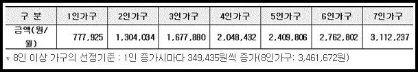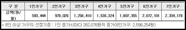 위 표의 금액이 받을 수 있는 최대의 금액입니다. 1인 가구일 때 제일 많이 받을 수 있는 생계급여는 583,444원, 2인 가구는 978,026원, 3인 가구는 1,258,410원, 4인 가구는 1,536,324원을 받을 수 있습니다. 하지만 이 금액은 가구 소득 인정액이 0원일때 기준입니다.